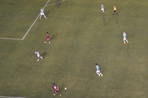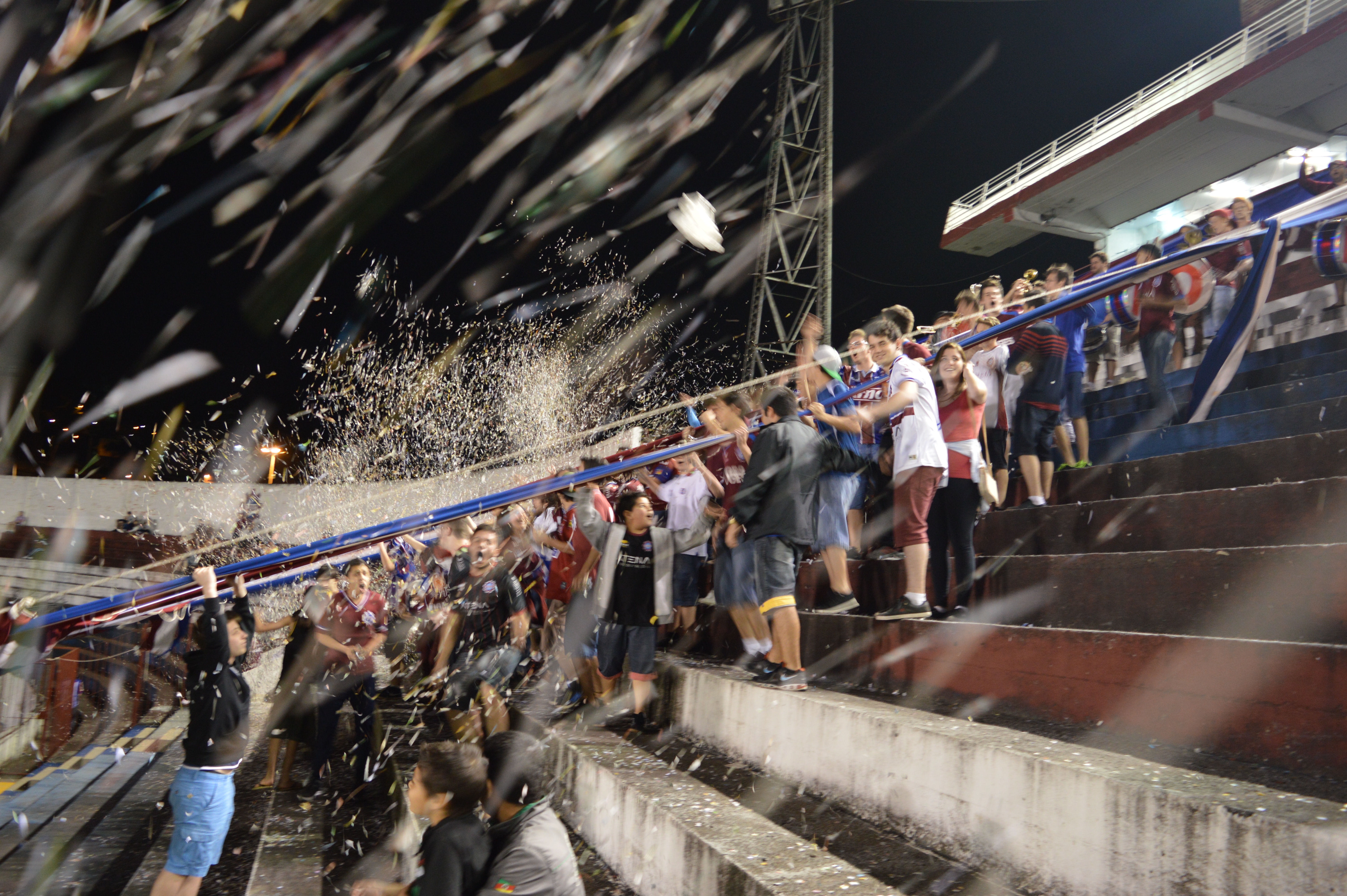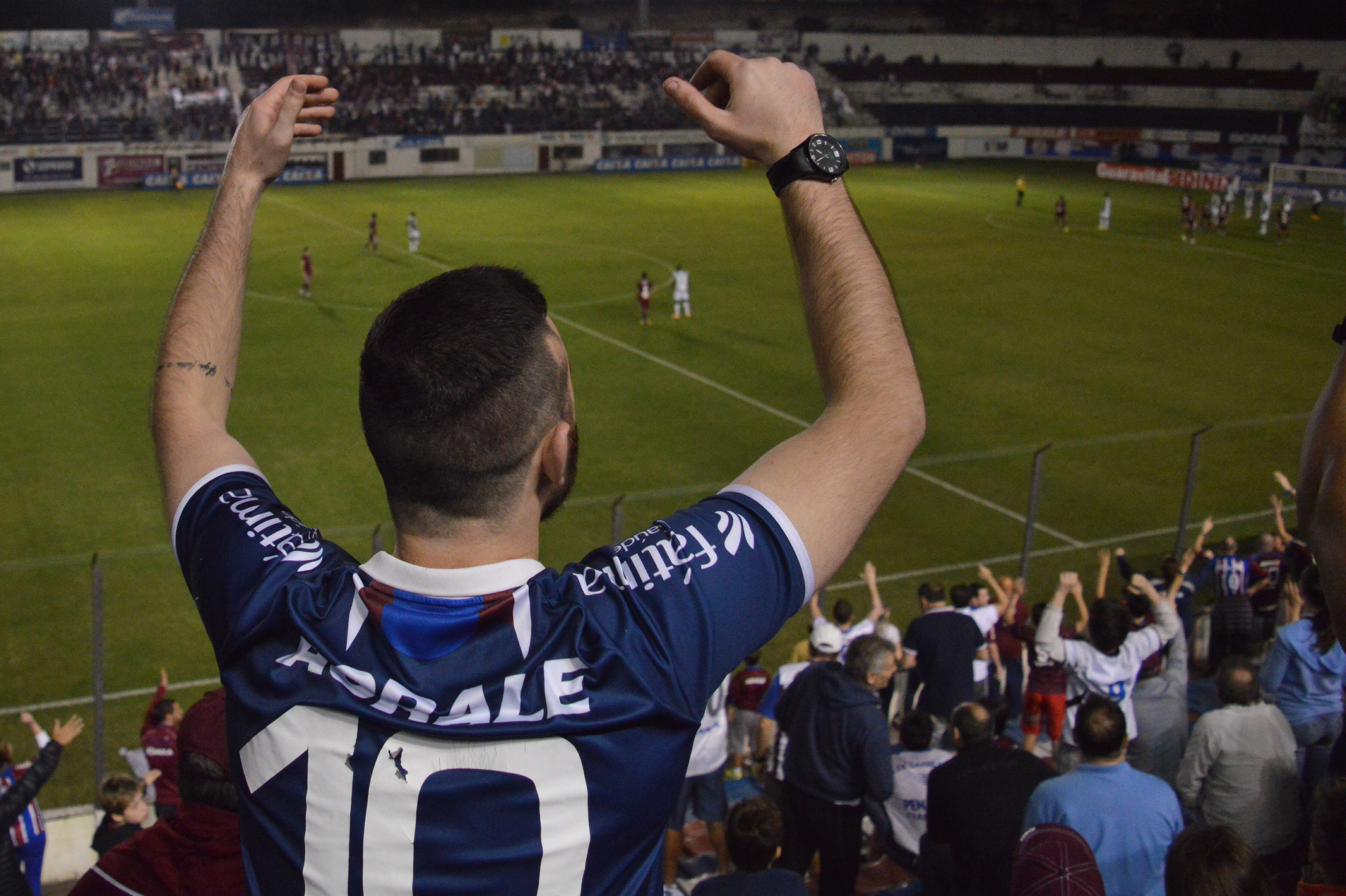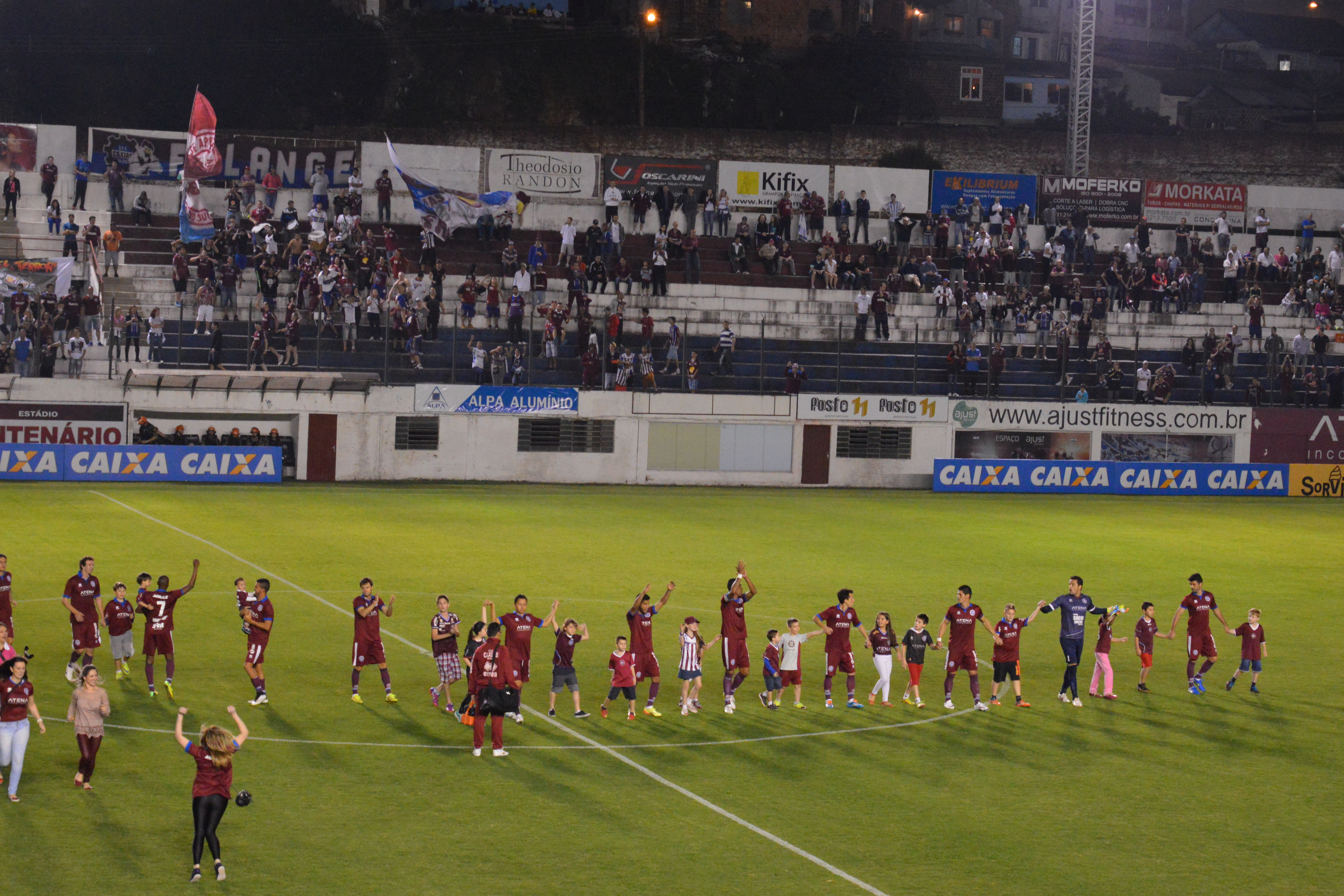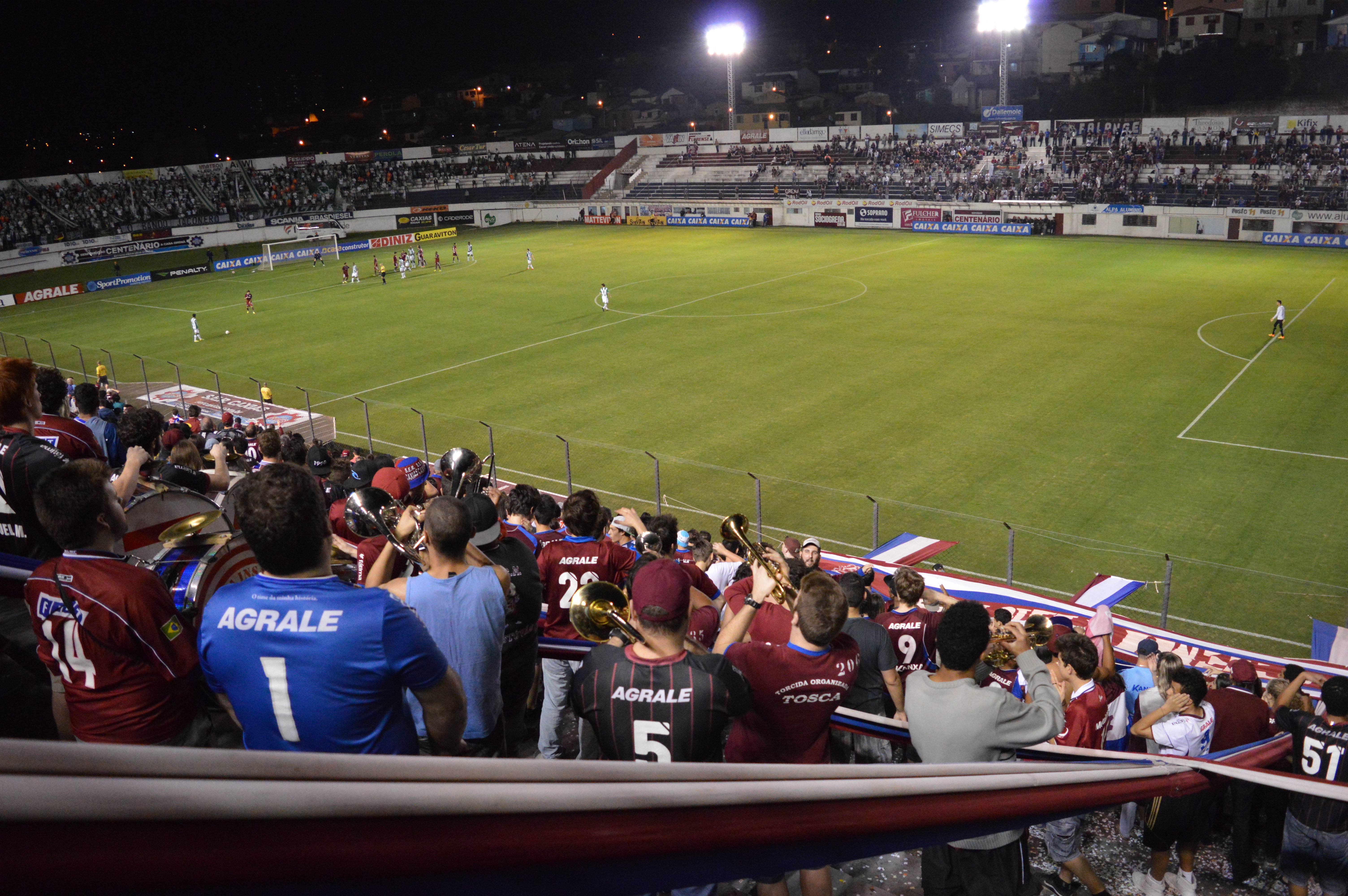 Percorri os três quilômetros que separam as principais canchas caxienses, registrando o bonito espetáculo protagonizado por mais de mil torcedores do Juventude. Chegando no Francisco Stédile, o Centenário, fui autorizado pelos dirigentes da equipe mandante a entrar no campo para fotografar. Entretanto, a representante da ACEG (Associação dos Crônistas Esportivos Gaúchos) barrou minha entrada, alegando que eu deveria ter feito o pré-credenciamento. Mas de buena, como eu não havia feito, pude ter acesso apenas às cabines de imprensa do estádio. O problema é que elas ficam anos-luz de distância do campo. Conclusão: fui para o meio da torcida do Caxias e registrei o clássico de lá.