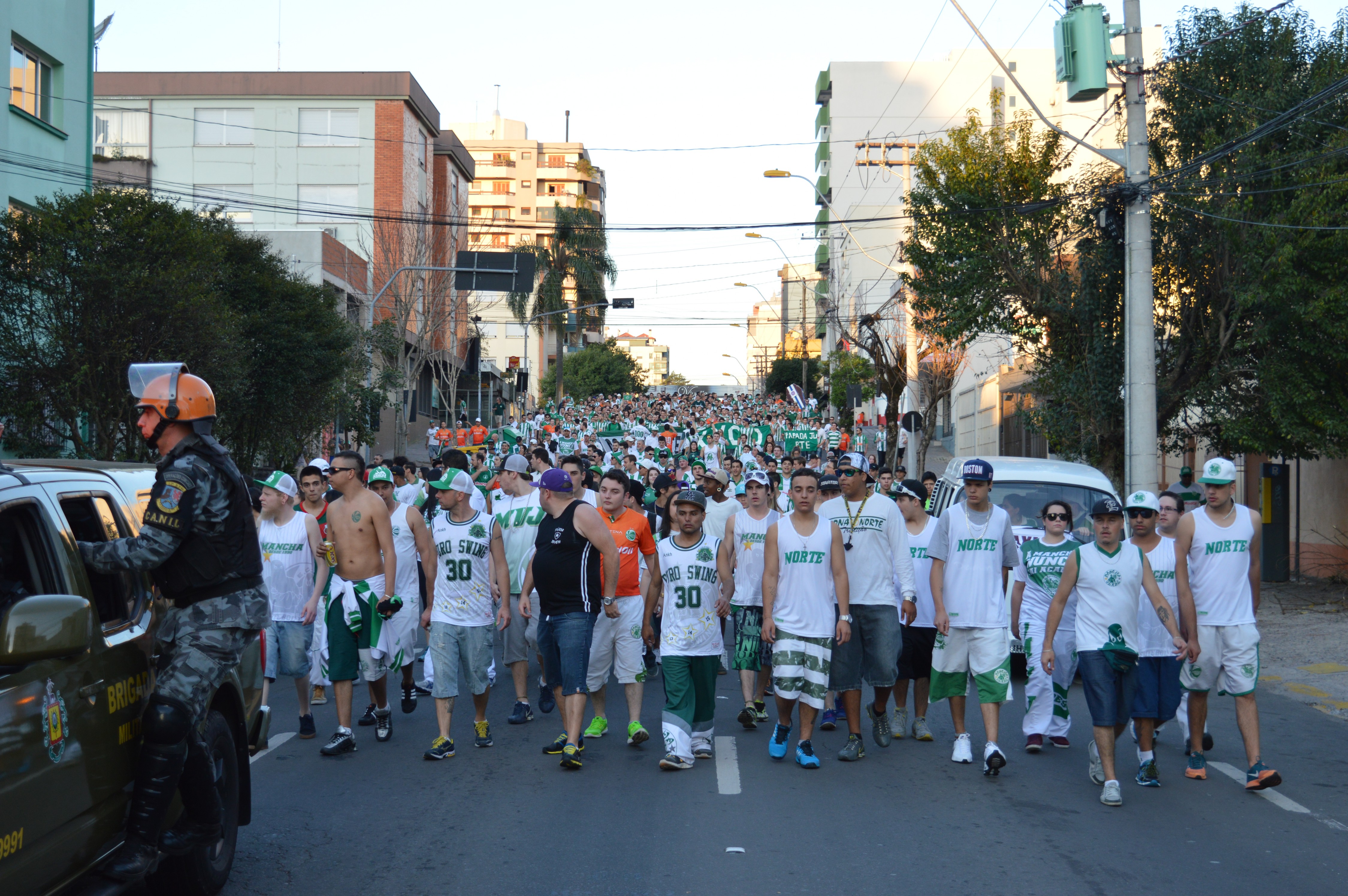 Assim que desci do ônibus, tomei o rumo do Alfredo Jaconi, que fica muito próximo à rodoviária – “mas o clássico não era no Centenário?”. Lá, fui super bem recebido pelos Loucos da Papada, em especial por Leonardo Benini e Guilherme Rodriguez, conheci as dependências do estádio jaconero e segui em deslocamento com a torcida do Juventude até o Centenário – que fique bem claro que, apesar das amizades, simpatizo igualmente com os dois times.