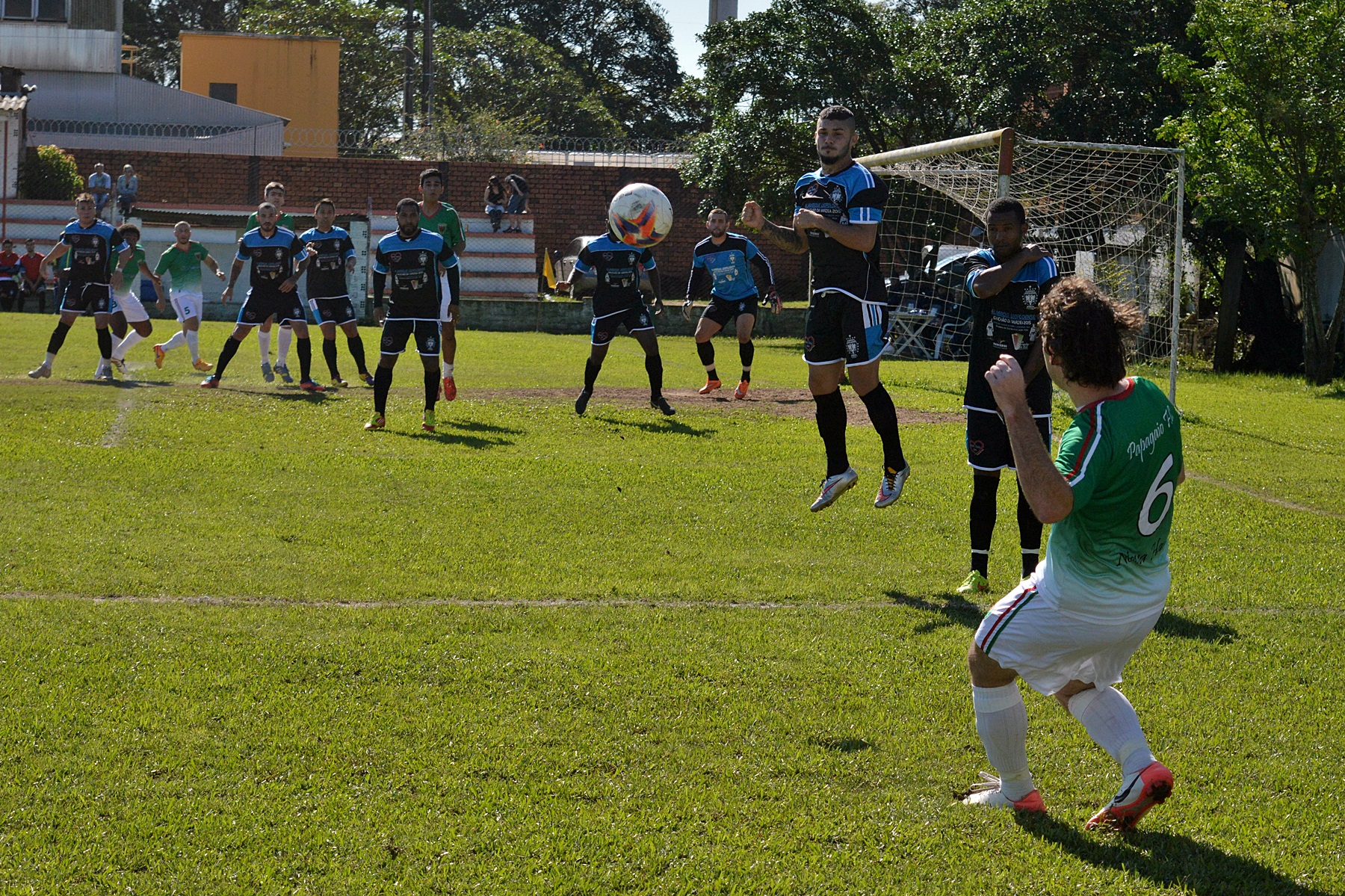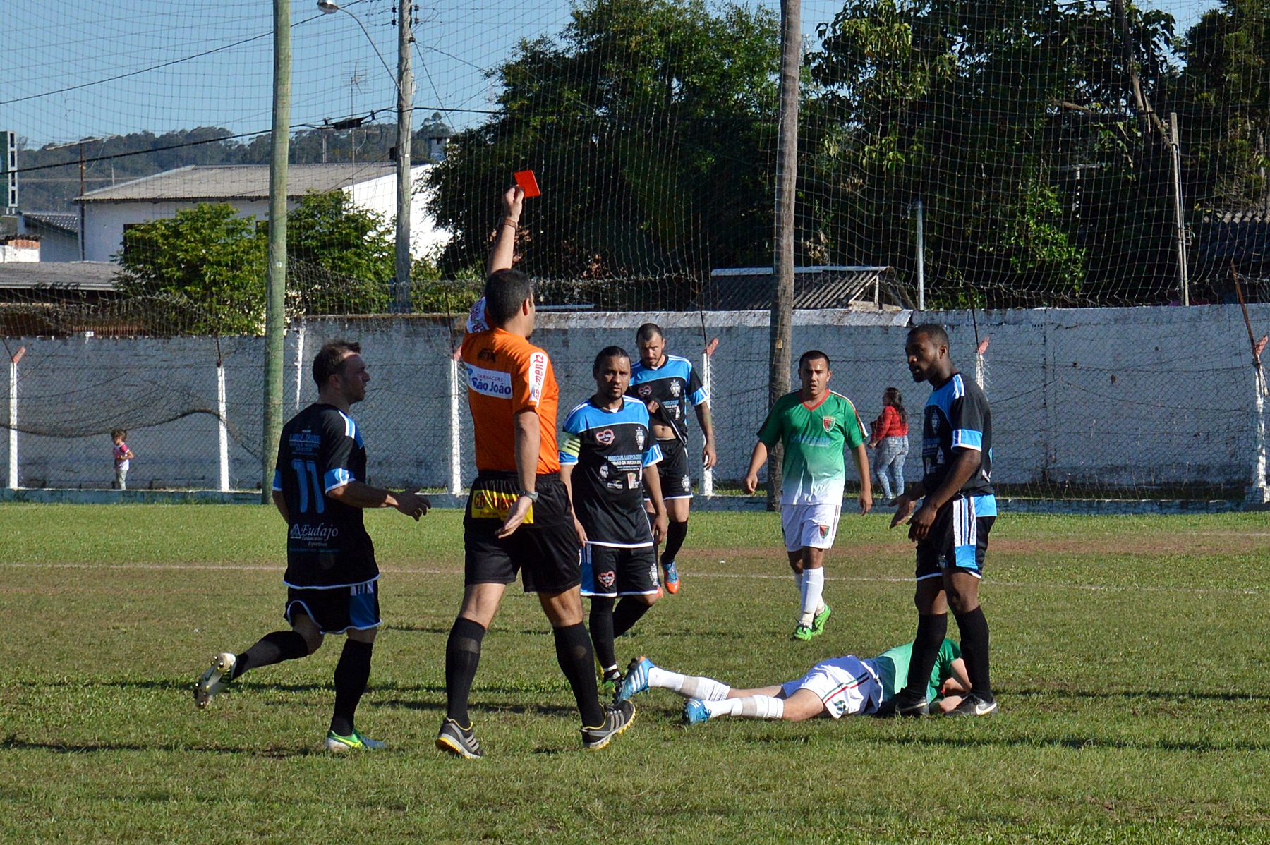 Mas, enfim, vamos ao que realmente importa: o relato da peronha rolando pelo histórico relvado do Nacional. Os primeiros 15 minutos foram bem, quase que literalmente, varzeanos mesmo. Na melhor chance, Julio Cesar, da esquadra de Nova Hartz, acertou a copa de uma pinheira (?) localizada atrás da goleira defendida por Alexandre. Aos 16, foi a vez do Papagaio chegar mais perto do gol, em falta bem cobrada pelo lateral Lucas. No minuto seguinte, o Alambique respondeu com um belo contra-ataque puxado por Rudinei, que tocou para Bruno Coelho chegar chutando e Joceir, por questão de centímetros, não alcançar a bola. Depois disso, o jogo começou a ficar bom e, em respeito às tradições locais, começaram a se suceder as primeiras cenas um tanto quanto lamentáveis da tarde.
